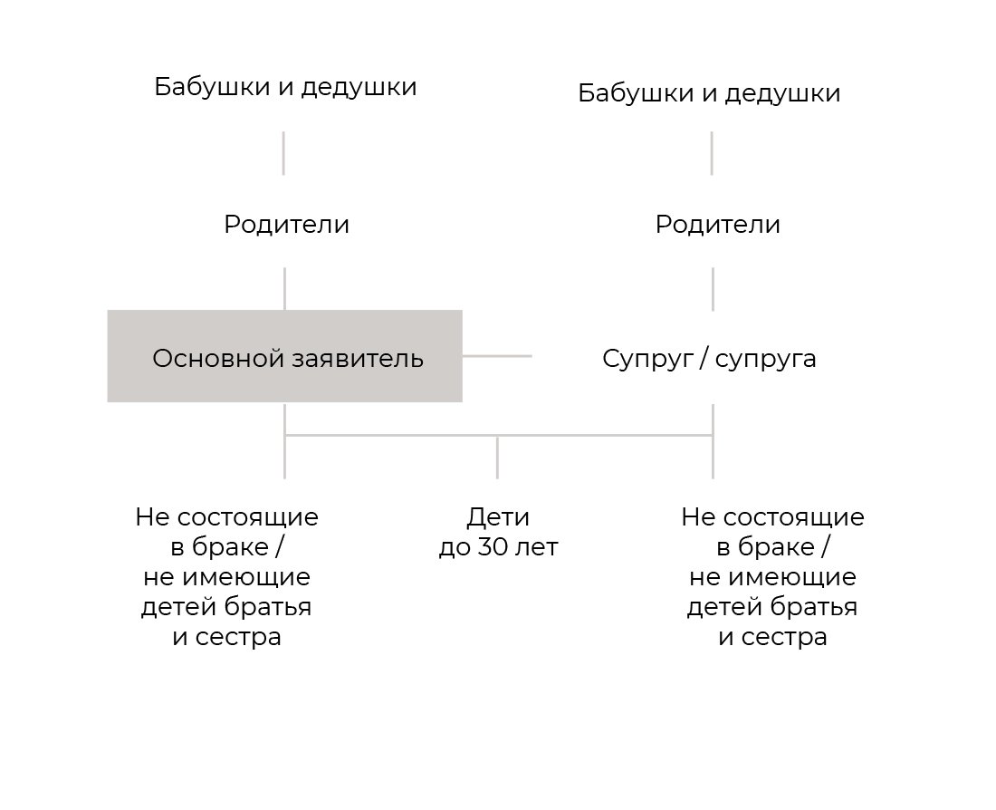 В одном заявлении: супруги, дети в возрасте до 30 лет, родители и бабушки/дедушки основного заявителя и супруги, а также не состоящие в браке братья и сестры. Гражданство передается по наследству.
