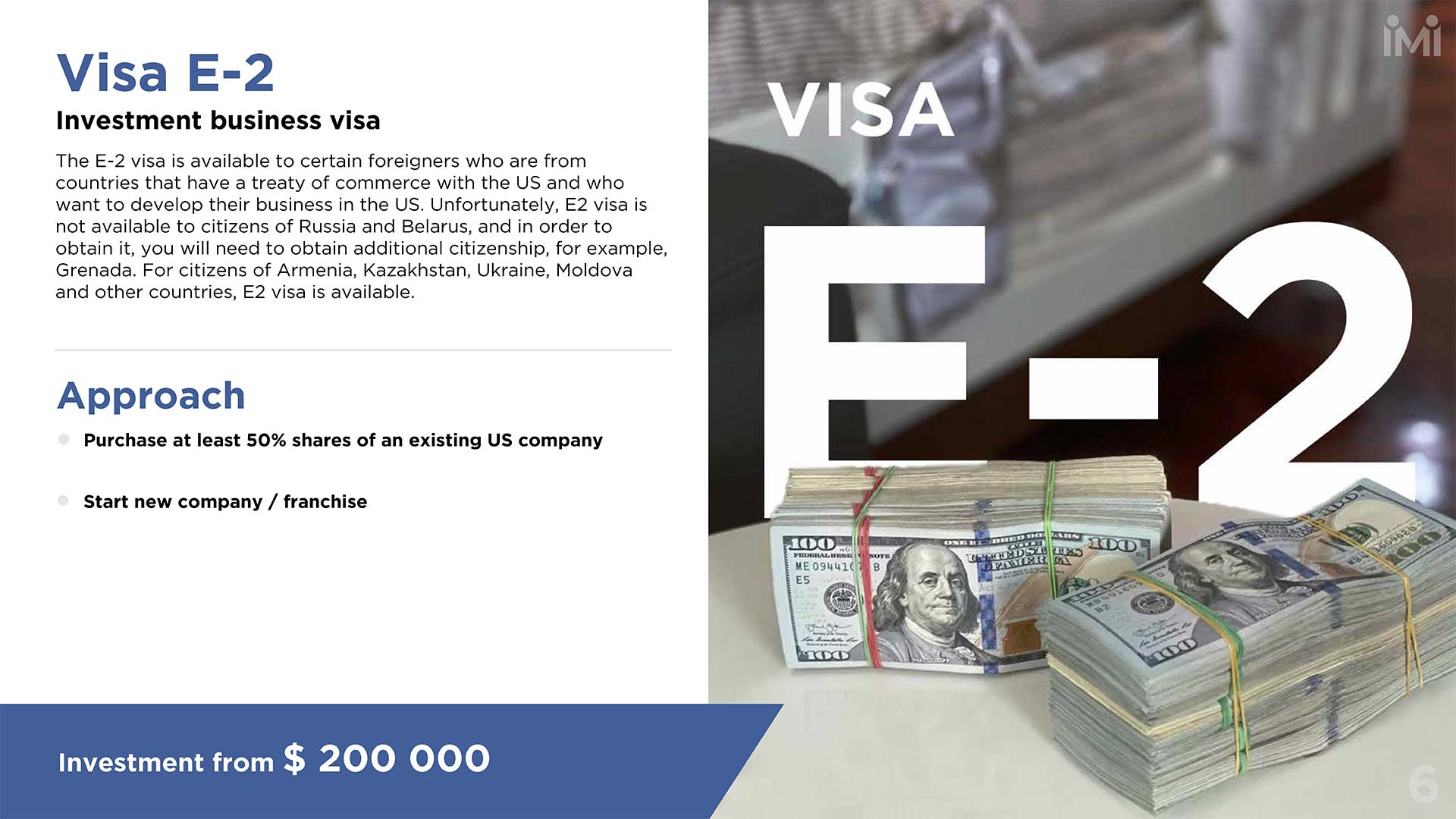 • Purchase at least 50% shares of an existing US company OR start new company / franchise.