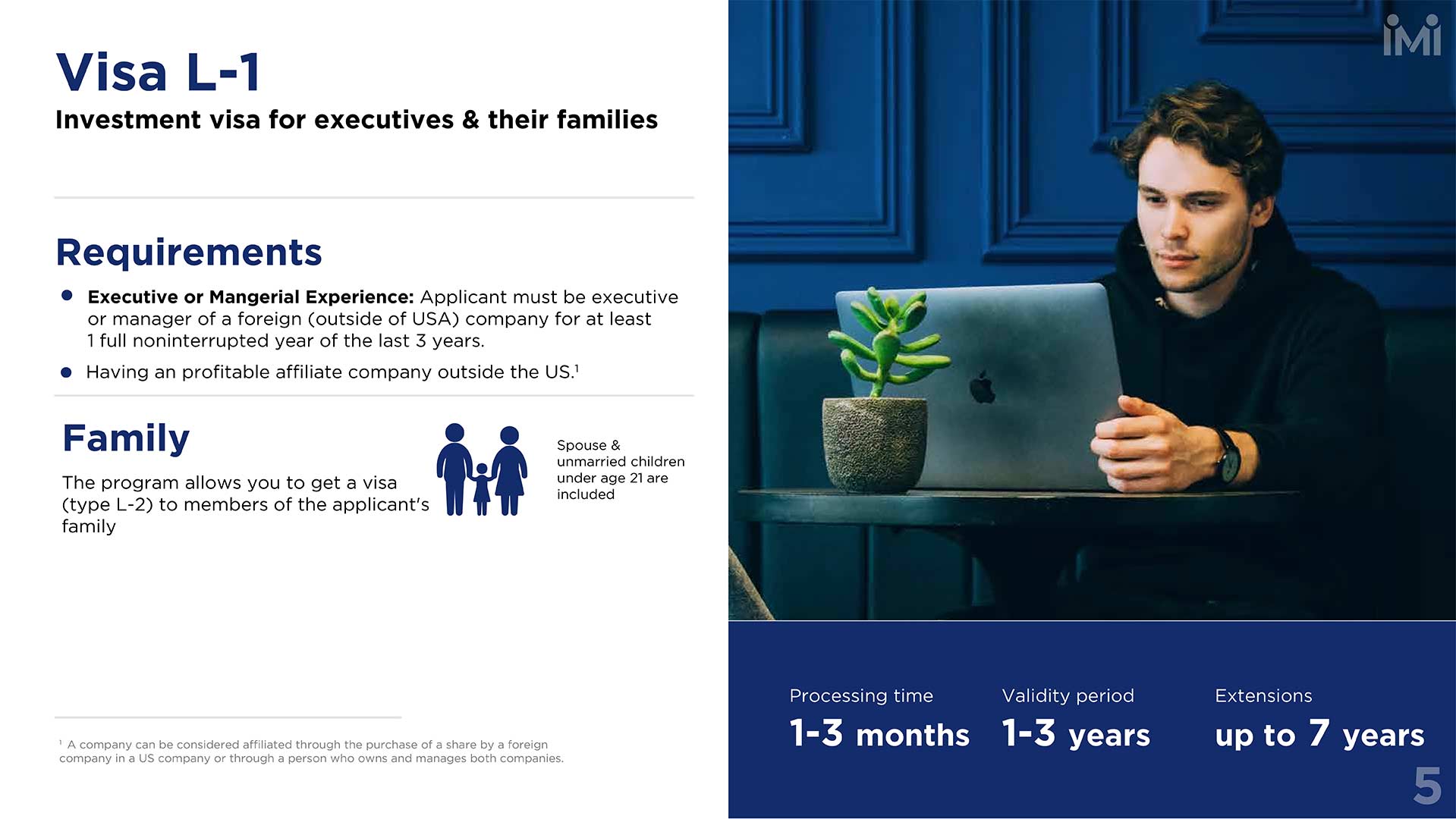 The L-1 Visa allows you to obtain a visa for your family, incl. spouse, unmarried children under age of 21 ⠀
